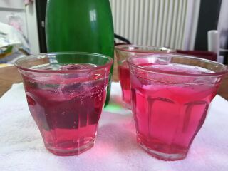 出来上がった赤ジソジュースを無糖炭酸で割って頂きました~!初挑戦にしては美味しく出来ました(^_^)