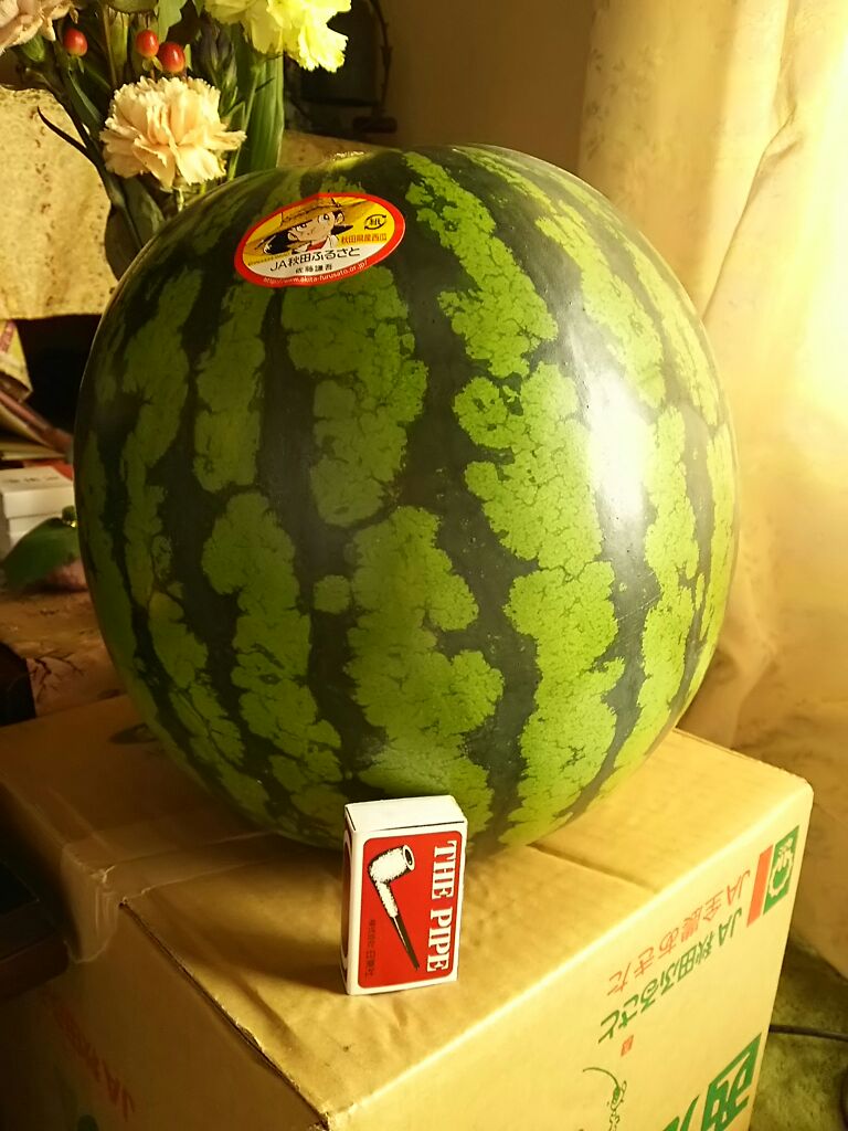 夏真っ盛りを過ぎると知り合いの方から頂く、秋田県名産三平マークの付いた5Lの巨大スイカ!